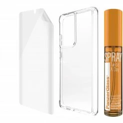 Der ultimative PanzerGlass-Schutz für Samsung Galaxy S21 Ultra. Dieser Rundum-Schutz beinhaltet einen PanzerGlass-Displayschutz TPU, ein durchsichtiges TPU-Back-Cover und ein Twice a day Spray (30 ml), durch die das Smartphone über einen 360⁰ Komplettschutz verfügt. Der Bildschirmschutz ist aus ultradünnem und flexiblem TPU hergestellt, das zudem einen antibakteriellen Effekt hat.